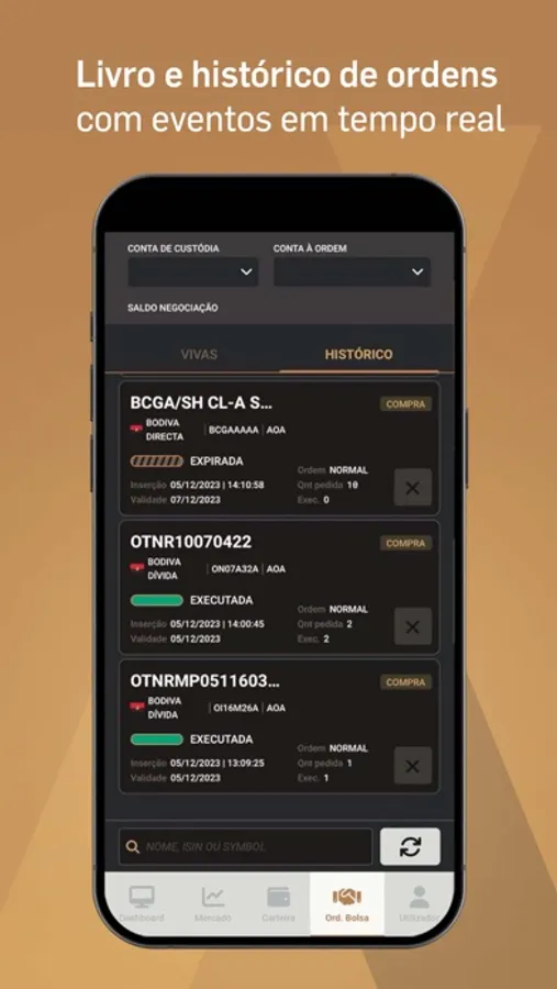 - Livro de ordens e histórico de ordens com eventos em tempo real;