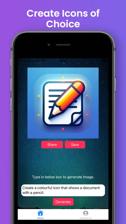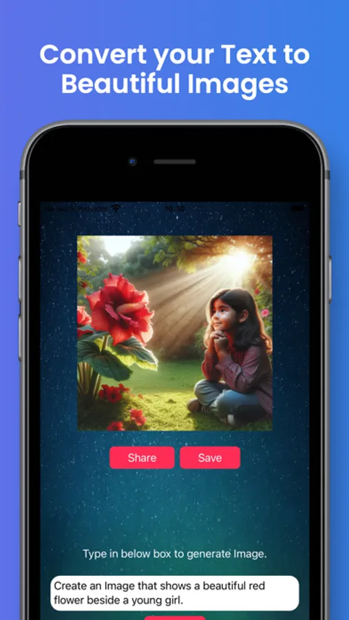 Transform your text into stunning images with "Text to Image Maker"! Whether you need images, icons, or logos, just describe what you want, and our app will bring your vision to life. With a simple text description, you can generate beautiful, high-resolution images (1024x1024) effortlessly. Save your creations to your Photo Gallery, Files app, or share them with others in just a few taps. Unleash your creativity with "Text to Image Maker" and make your ideas shine!