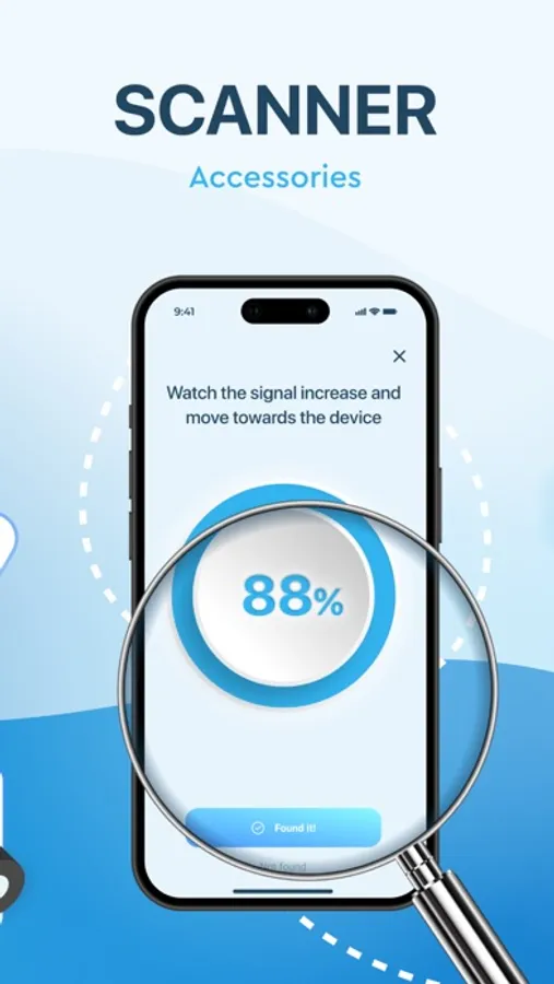 The app detects all nearby devices. Find and select your lost device from the list, then move slowly and monitor the on-screen signal strength, estimated distance, and hints.