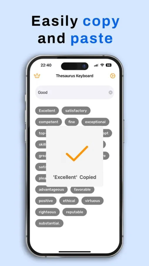 Thesaurus Synonyms AI Keyboard seamlessly integrates with your iOS keyboard, making it incredibly easy to use across all your favorite apps. From messaging and social media to email and note-taking, this app works wherever you type. The intuitive interface ensures that finding and using synonyms is quick and hassle-free, allowing you to maintain your writing flow without interruption.