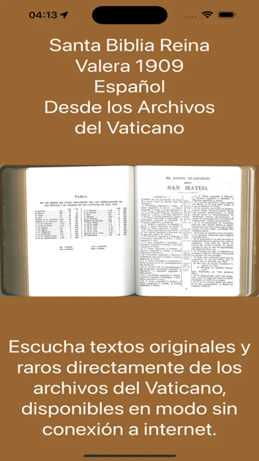 Bible RV 1909 — the official app of the Federación de Entidades Religiosas Evangélicas de España (FEREDE) — lets you listen to rare and original texts of the Reina-Valera 1909 Bible in offline mode. These recordings come directly from Vatican archives, providing access to authentic historical documents. The app does not require Internet access and does not collect personal data, ensuring complete privacy. Use it to listen to biblical texts anytime and anywhere, with no network connection.