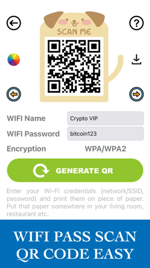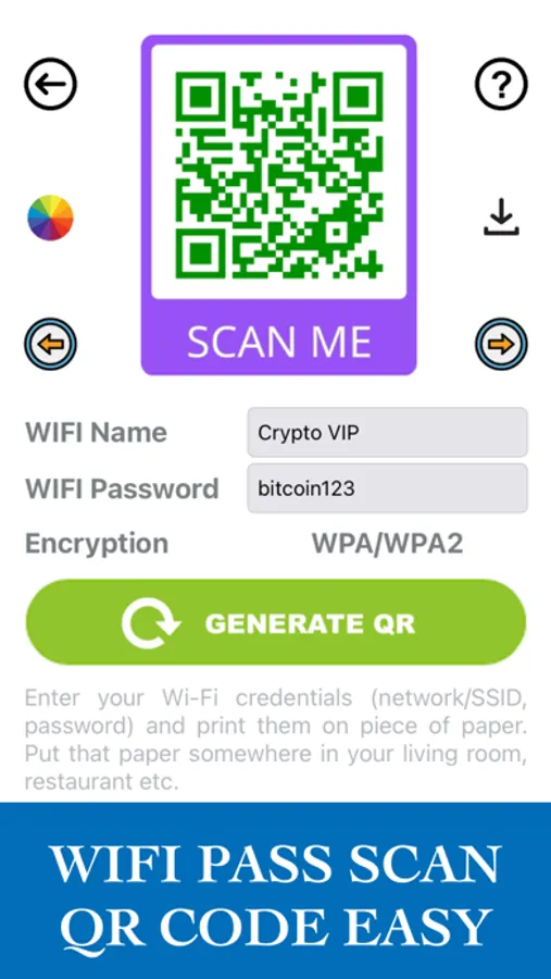 NOTE: This is NOT an application to hack wifi pass, get wifi password or show wifi pass! This is an application only to create QR code from your WIFI, for guests to connect conveniently without having to ask for wifi password: Join wifi without password - Only scan QR code!