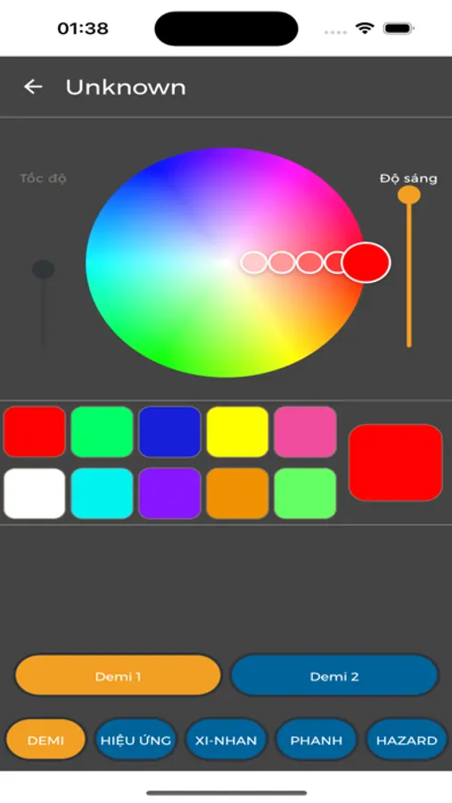 - Thẻ hiệu ứng: chọn hiệu ứng, màu sắc, tốc độ cho đèn LED demi, có tổng cộng 289 hiệu ứng và 1 hiệu ứng chạy tự động (A).
