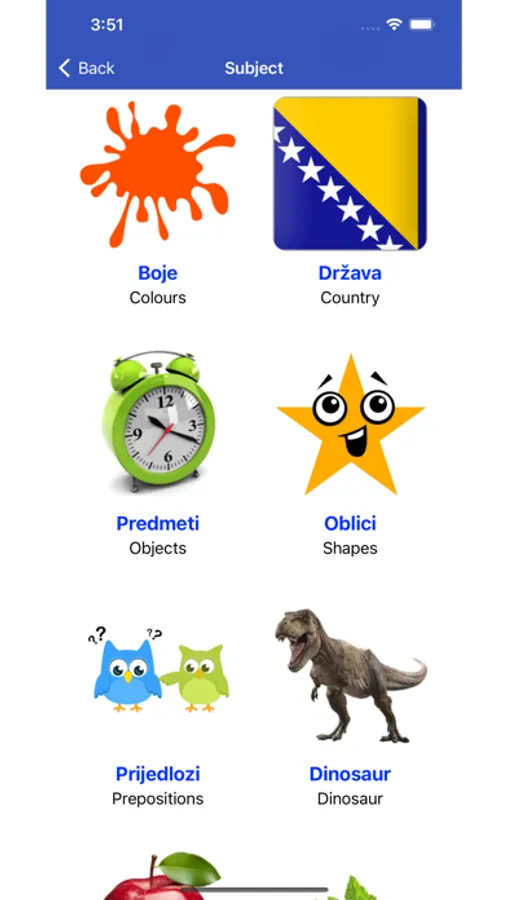 * Animals: includes 90 animals with real pictures of them. Your you very love animals so it help you impression and want to learn Bosnian.