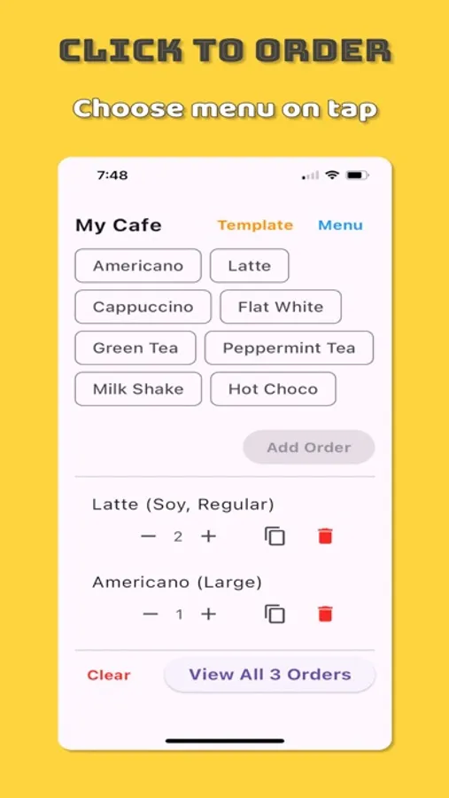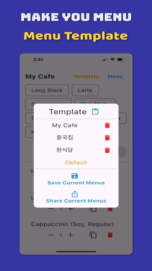 The "Cafe Order" app helps you place orders for drinks or food at cafes and restaurants with ease, without testing your memory or needing cumbersome notes. Simply touch the order menu, select options and quantities, and the app will organize your order for you. No more double-checking menus or getting chided by friends for order mistakes. The "Cafe Order" app solves it all. Missing a menu item or option? No worries. Adding new items or modifying options is simple. You can also save all menus as templates and share them with friends.