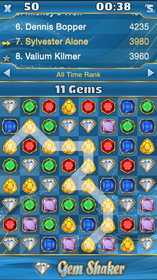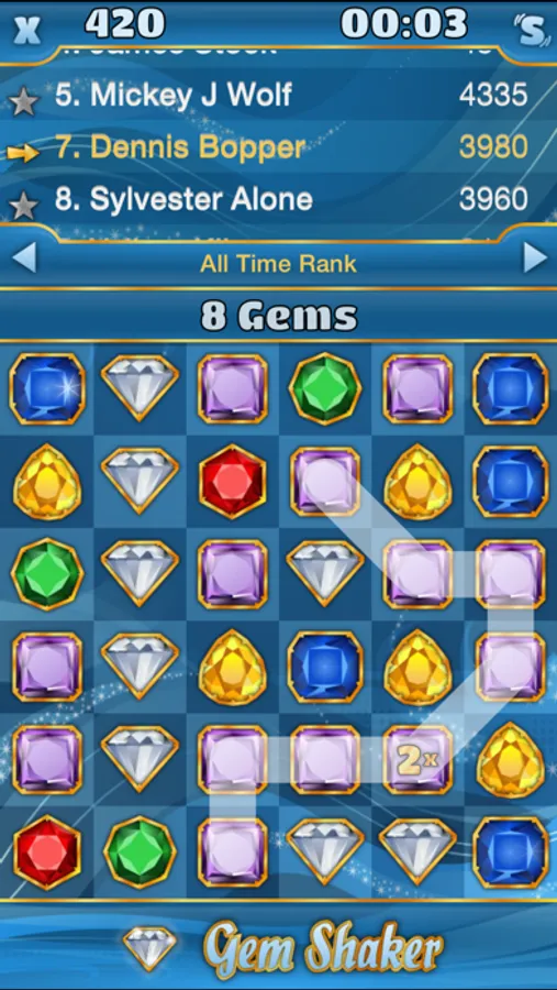 Gem Shaker, the gem matching game with a twist. Slide over adjacent gems of the same type to make a chain. Chains must have 3 or more gems, the longer your chain the more points you gain.