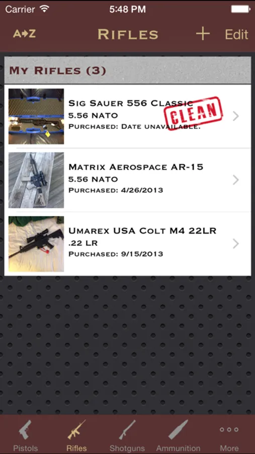 Additionally, you can store information about your ammo inventory, accessories, knives, and your visits to the shooting range. Ammo inventories are even updated as you record their usage at the range. And visual alerts let you know of a firearm that needs to be cleaned.