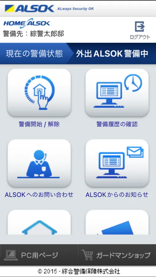 このアプリでは、①警備操作、②ご自宅の警備状況の確認、③警備履歴の確認、④ALSOKガードセンターへの連絡、⑤お知らせの確認、⑥各種サービスの利用・問い合わせが行えます。