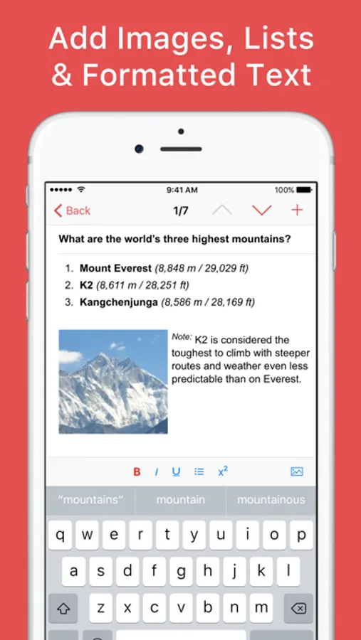 We made Flashcard Hero for those of you who want to fit more than a few words on each card. You can add images, lists, and use text formatting to structure your content.