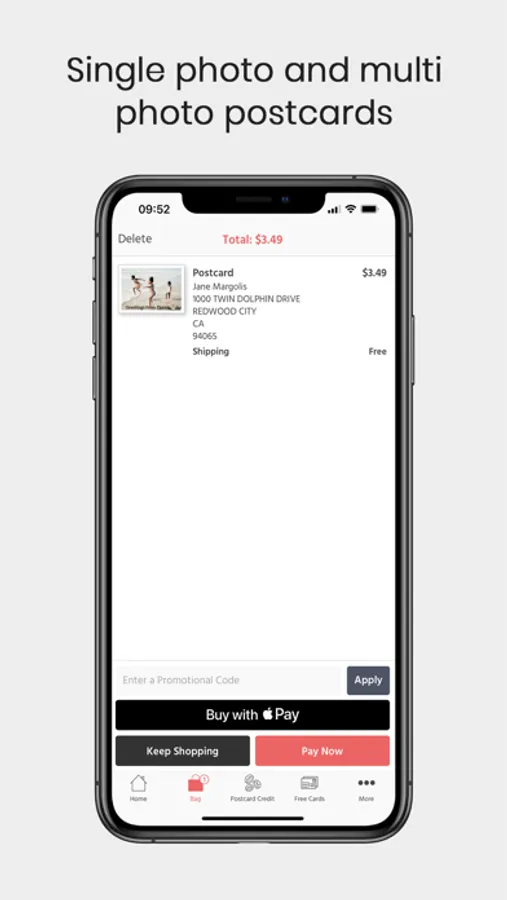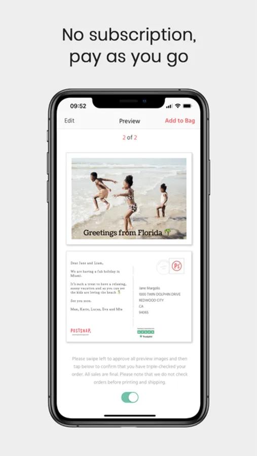 Our personalized postcards are priced at just $3.49 each including 1st class USA postage. We’ll even mail your photo postcard anywhere in the world for a small additional shipping charge. What’s more, there is no subscription or sign up (with Apple Pay) and no confusing credits - you simply pay as you go for your postcards.