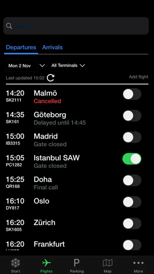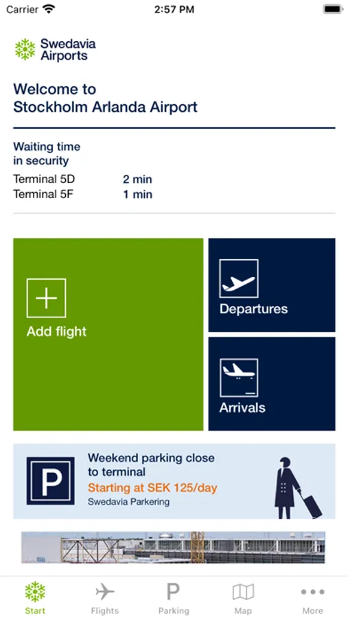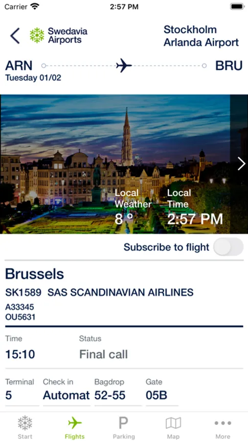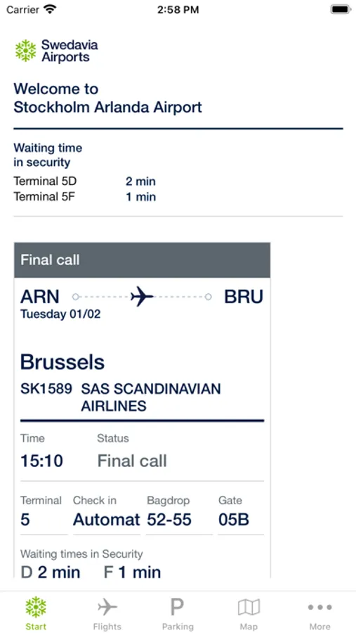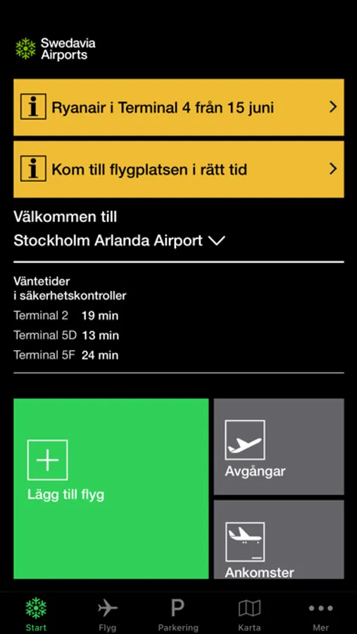 Waiting time at the security checkpoints at Stockholm Arlanda Airport, Göteborg Landvetter Airport and Bromma Stockholm Airport. When you’ve added your flight to the start page, the waiting time at the security for your particular flight is shown. You also get information about the terminal, check-in counter and gate.