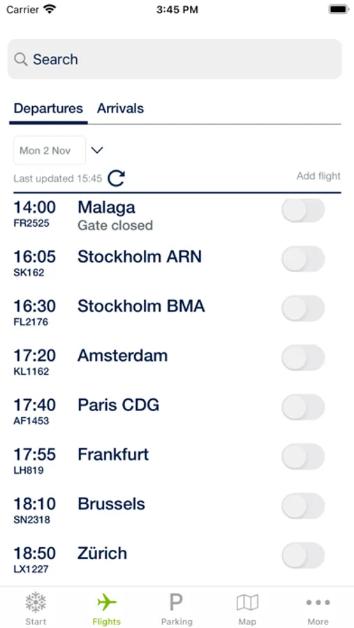 Here’s where you get all the information about your flight: waiting time at the security checkpoint, arrival/departure, gate and check-in counter. Add your flight to the homepage and check in right in the app. If you are landing at one of Swedavia’s airports, you see when your baggage is expected to arrive.