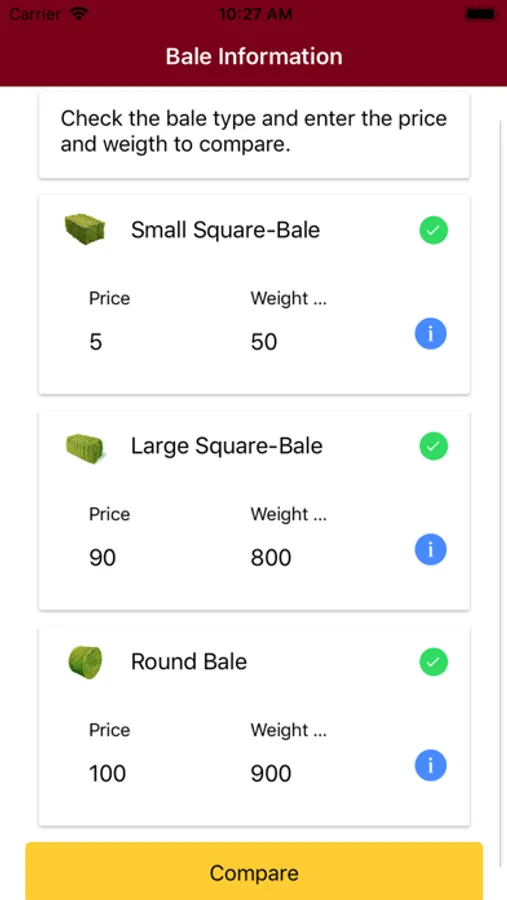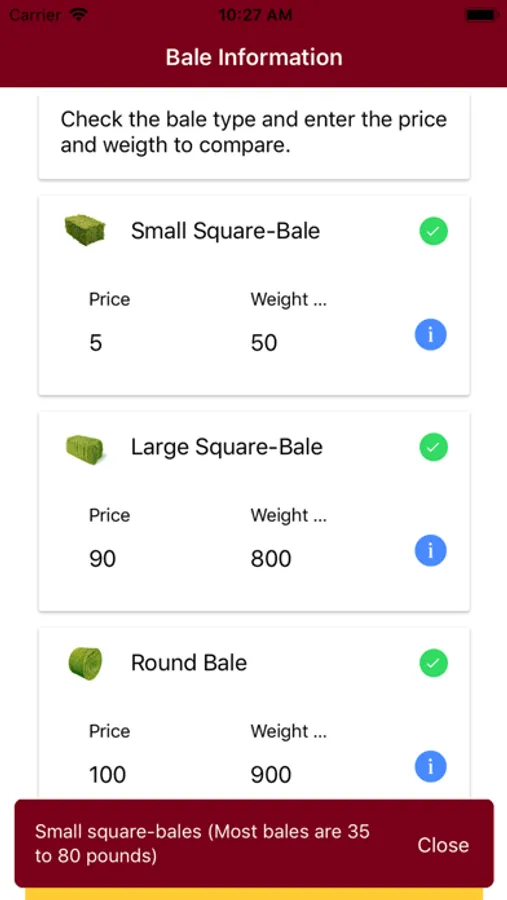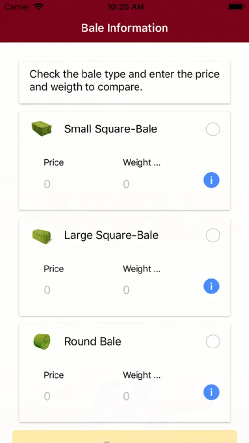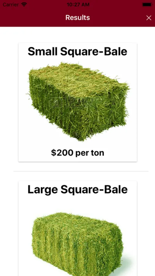 Buy hay the smart way! Many horse owners and hobby farmers purchase hay by the bale. However, the more economical way to purchase and compare different hay types is to calculate the price per ton. The aim of the Hay Price App is to aid hay buyers in calculating price per ton and to provide cost comparisons of small square, large round, and large square-bales. Hay buyers simply select the bale type, enter in the bale weight and price per bale, and the Hay Price App calculates price per ton, allowing the buyer to compare and choose the most economical hay. This app does not take into account hay quality when determining economics.
