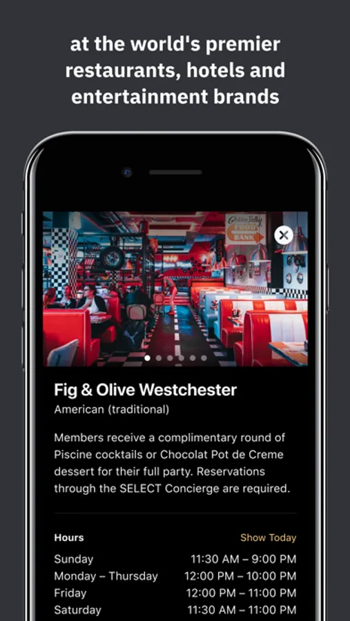 SELECT partners with best-in-class brands and venues across categories to provide exclusive, on-demand benefits to our members. We're talking 15-30% off the bill or complimentary items (or both) at renowned restaurants, up to 60% off room rates at over a million hotels worldwide, and significant private discounts with leading travel, retail, lifestyle, and entertainment brands including BMW, Tumi, Lazzoni, Caraway and many more.