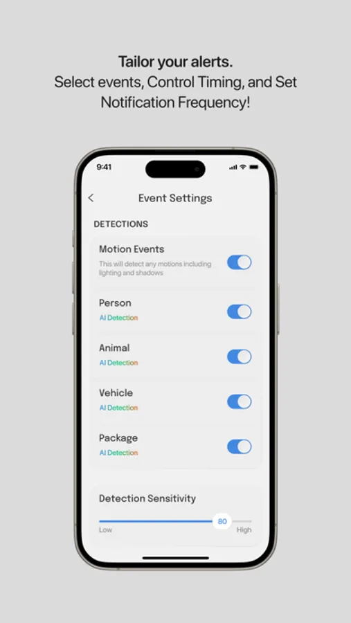 - Events Tagging: Our state of the art AI detects and categorizes specific type of movements, such as people, vehicles, or animals alerting you with relevant information along with a video clip for each event.