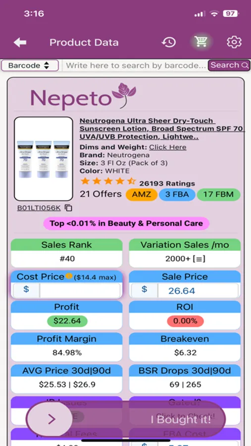 Our mobile app for retail arbitrage allows you to scan items or take photos using AI image search, providing instant data insights. Download it now at nepeto.app!