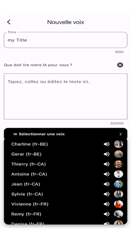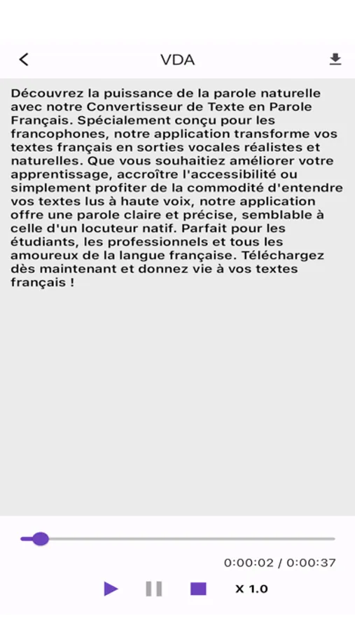 Découvrez la puissance de la parole naturelle avec notre Convertisseur de Texte en Parole Français. Spécialement conçu pour les francophones, notre application transforme vos textes français en sorties vocales réalistes et naturelles. Que vous souhaitiez améliorer votre apprentissage, accroître l'accessibilité ou simplement profiter de la commodité d'entendre vos textes lus à haute voix, notre application offre une parole claire et précise, semblable à celle d'un locuteur natif. Parfait pour les étudiants, les professionnels et tous les amoureux de la langue française. Téléchargez dès maintenant et donnez vie à vos textes français!