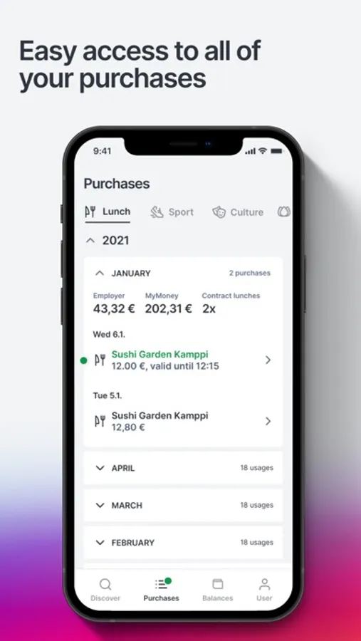 Epassi offers a unique multi-wallet solution – no more need for vouchers, cards or coins. By loading some MyMoney balance, you can easily pay for any services that exceed your benefit limits without a fuss. Your benefit balances and payment receipts are always in your pocket.