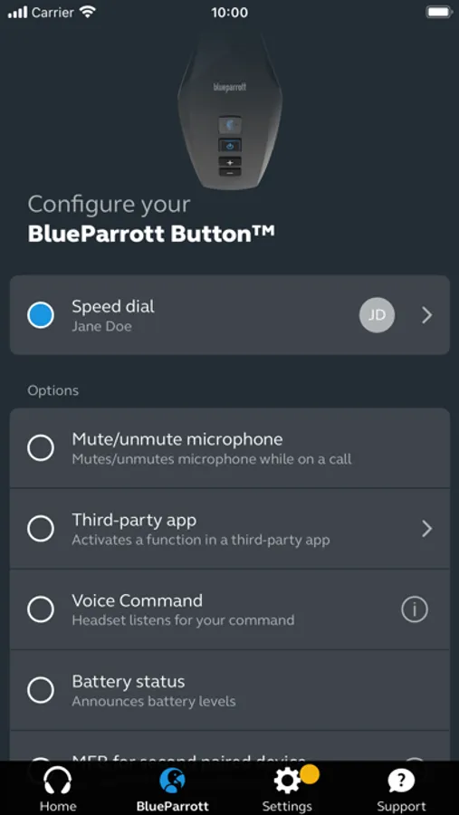 Program your BlueParrott Button™ from your mobile device and get fast access to your favorite features such as mute, speed dial and more.