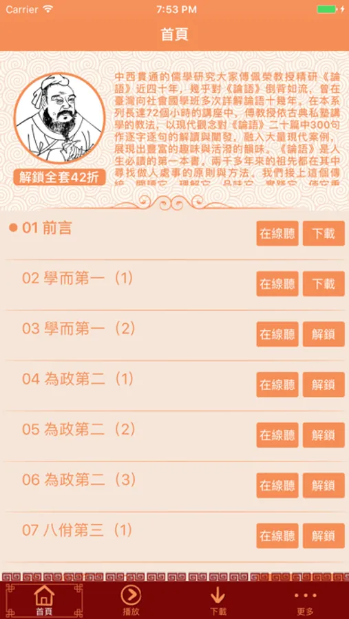 中西贯通的儒学研究大家傅佩荣教授精研《论语》近四十年,几乎对《论语》倒背如流,曾在台湾向社会国学班多次详解论语十几年。在本系列长达72个小时的讲座中,傅教授依古典私塾讲学的教法,以现代观念对《论语》二十篇中300句作逐字逐句的解读与阐发,融入大量现代案例,展现出丰富的趣味与活泼的韵味。《论语》是人生必读的第一本书。两千多年来的祖先都在其中寻找做人处事的原则与方法。我们接上这个传统、阅读它、理解它、品味它、实践它,使它重新展现新颖的活力与创意。