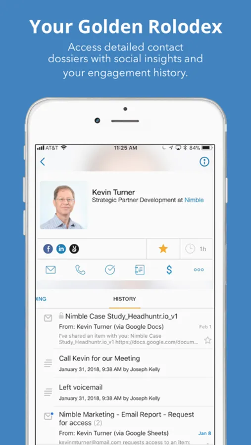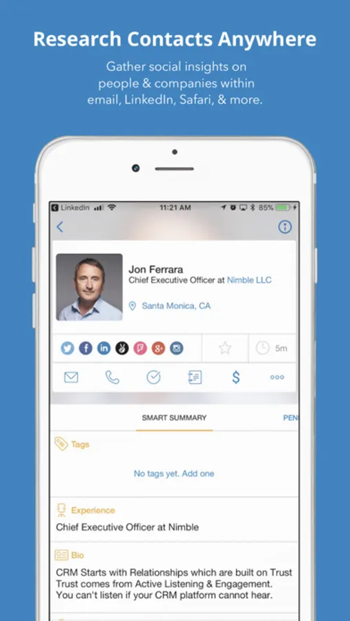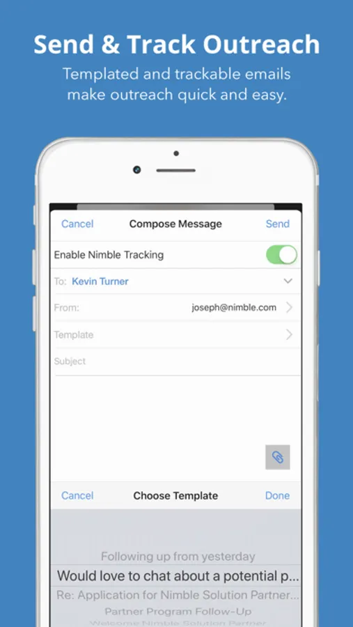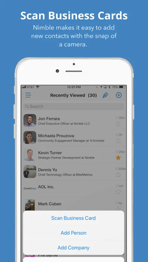 Nimble’s mobile CRM takes contacts from your address book, email, contacts, and calendar and combines them with your entire Nimble database into a unified relationship manager that delivers detailed dossiers on contacts you’re prospecting, qualifying, or meeting with today. Nimble also enables you to follow up on conversations and follow through on projects as effectively and productively as you do while working on the go as in your office.