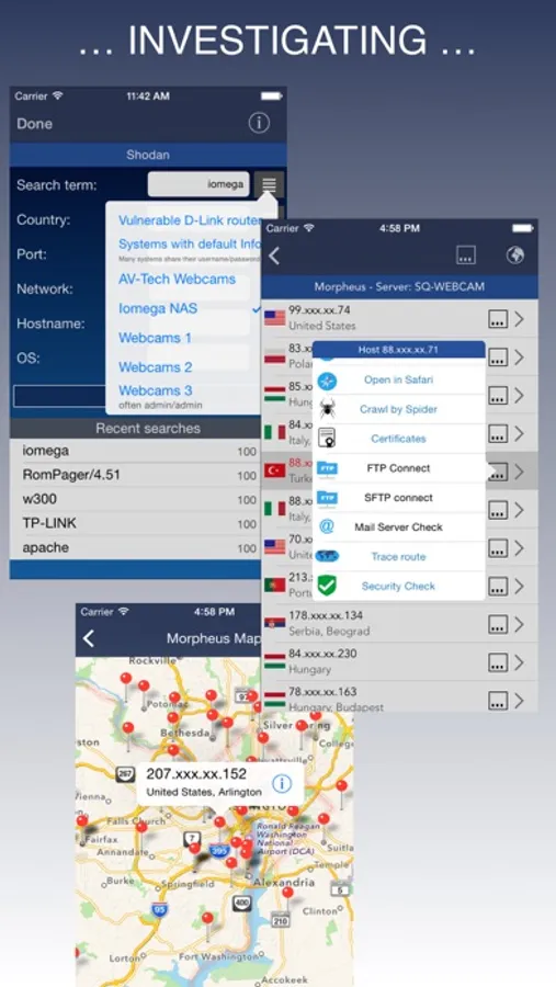 It provides various scanning options such as WiFi Network IP scanning, Port scanning and integrates the SHODAN scan engine, Security exploit tests and more.