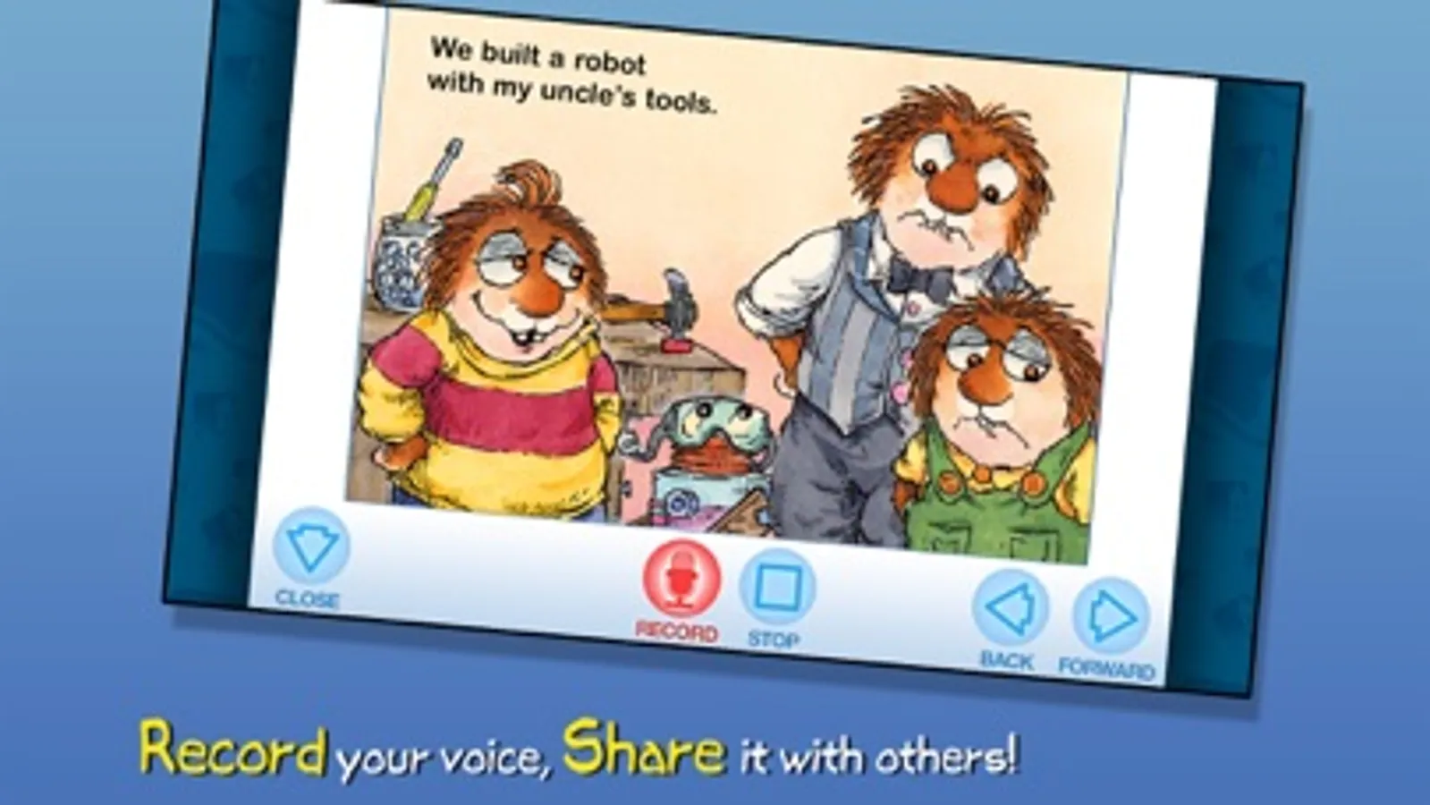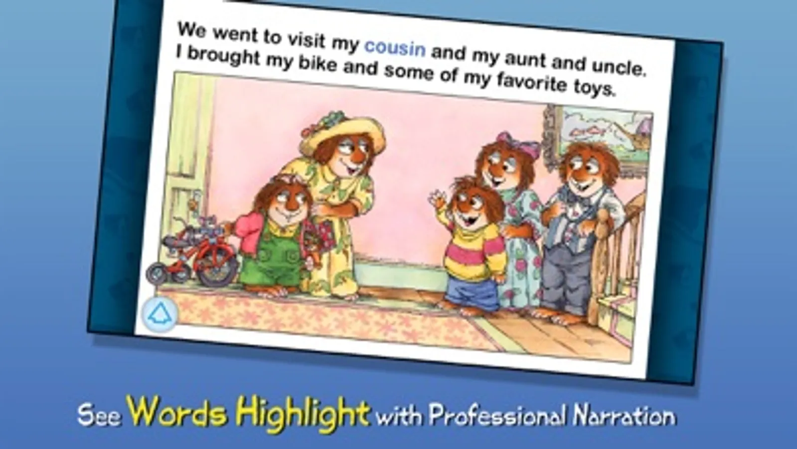Join Little Critter in this interactive book app as he quickly learns that playing with his cousin is not always easy (or fun). Explore pictures, learn new vocabulary, and personalize the story with your own narration. After pillow fights, tattletailing, checkerboards overturned, and more, how will his cousin save the day?