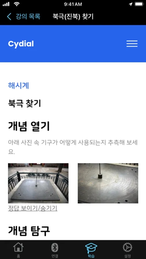 스마트 해시계 Cydial과 연결하여 위도를 조정하고, 해시계에 관련된 양질의 교수 학습 자료를 체험하실 수 있습니다.