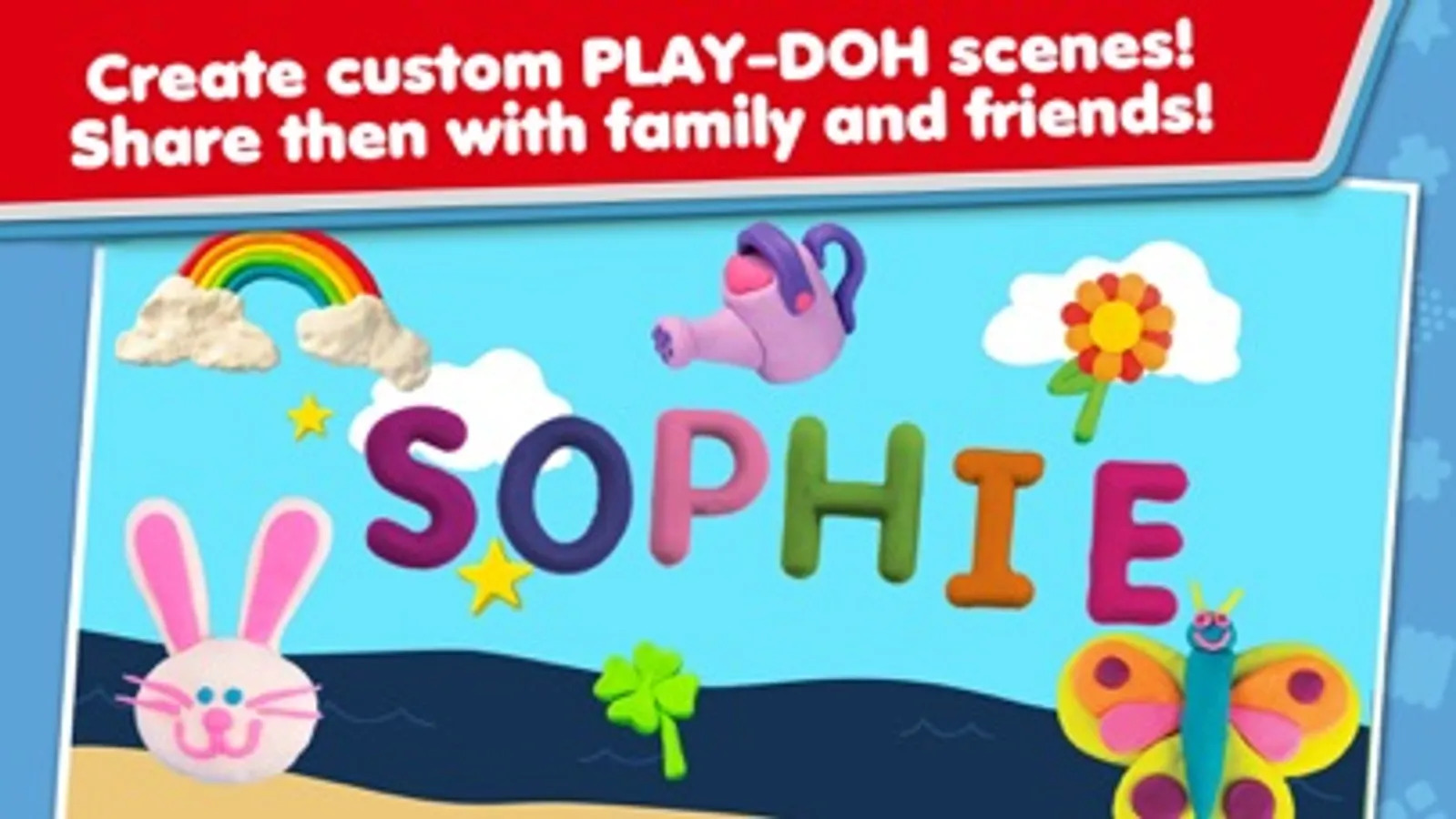Build your own PLAY-DOH scenes with your PLAY-DOH creations. The PLAY-DOH gallery is just a click away on the ‘create and share’ button. There you can enjoy all the animated, colorful objects you make as you work your way through the letters of the alphabet. Select your favorite background and then bring PLAY-DOH scenes to life with custom PLAY-DOH pictures. Save your creations on your phone or tablet and share them with others!