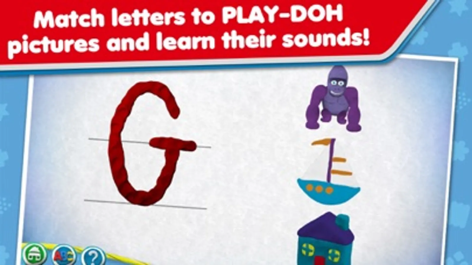 Click on the ‘match’ button and you can enjoy a new activity: matching letters with the PLAY-DOH creations. The ‘match’ feature reinforces initial letter sounds by matching letters with objects that start with the same sound. A letter select screen allows you to play the activity on any letter you choose. Can you match the letters of the alphabet to the different PLAY-DOH creations? Give it a try!