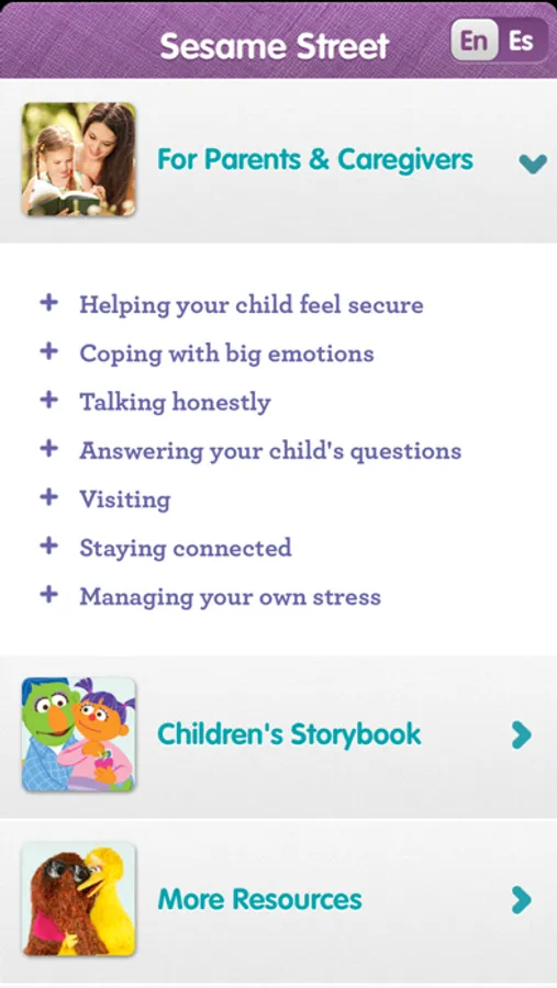 • Resources in this app are part of Sesame Street’s Little Children, Big Challenges: Incarceration initiative. You can access additional project materials online, at sesamestreet.org/incarceration.