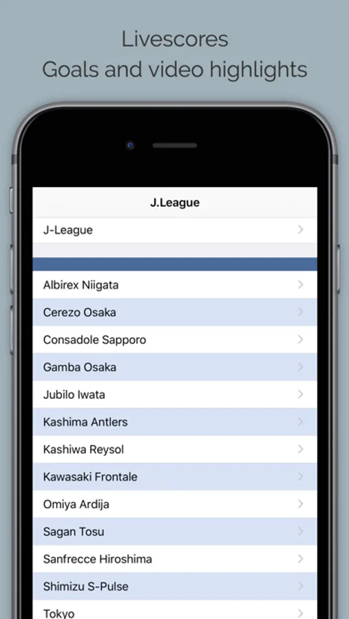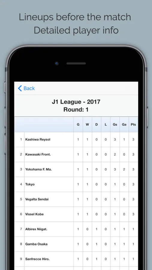 With this app you can also check all the stats for all the teams in the Japanese J League football competition (Omiya Ardija, Yokohama F. Marinos, Urawa Reds, Kashima Antlers, Sanfrecce Hiroshima, Tokyo, Cerezo Osaka, etc.)
