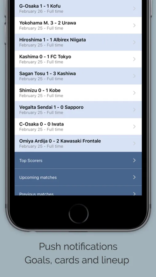 The J League app shows the scorers of each match, given yellow cards, red cards, penalties and so forth. You will also receive a push notification when your favourite team scores!