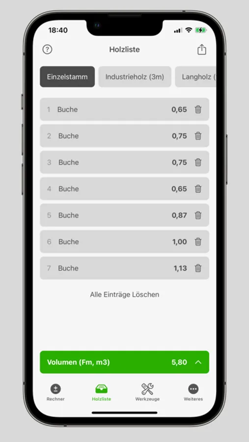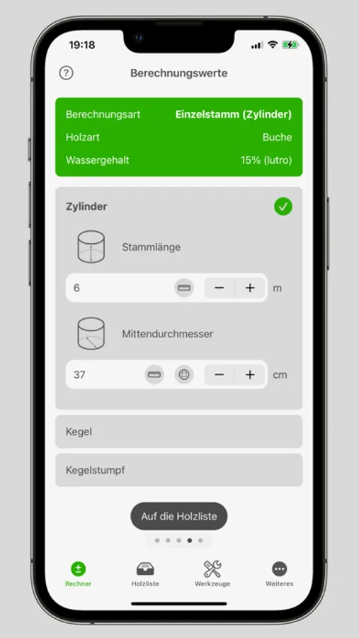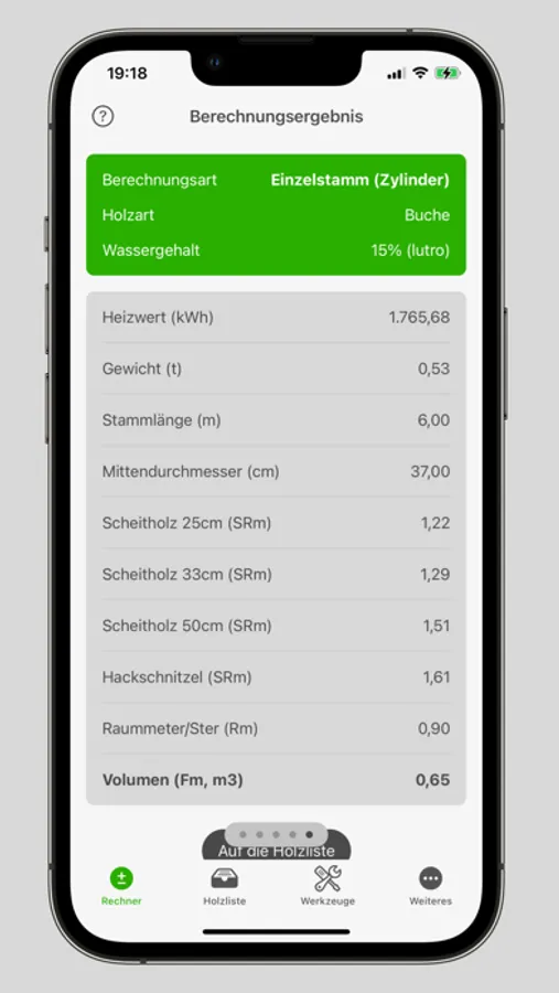 Das Volumen, Gewicht oder den Heizwert für verschiedene Holzarten und Holzformen mit Ihrem iPhone oder iPad und der Holzrechner Pro App berechnen und in der Holzliste speichern.