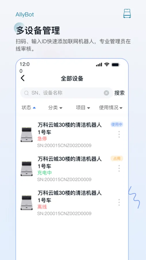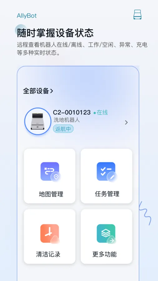 · 随时掌握设备状态——远程查看机器人在线/离线、工作/空闲、异常、充电等多种实时状态。