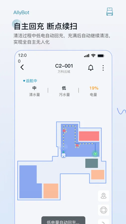 · 自主回充,断点续扫——清洁过程中低电自动回充,充满后自动继续清洁,实现全自主无人化。