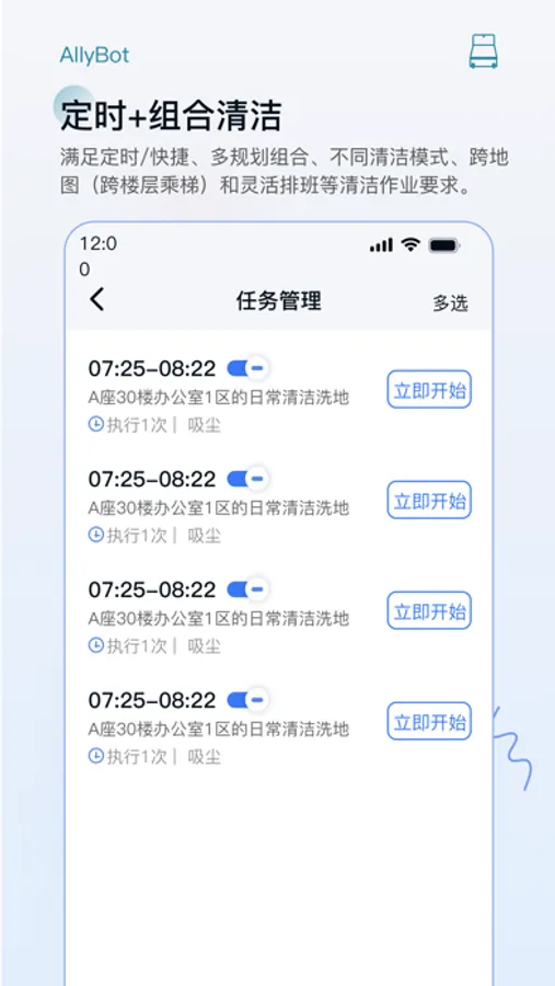 · 定时+组合清洁——满足定时/快捷、多规划组合、不同清洁模式、跨地图(跨楼层乘梯)和灵活排班等清洁作业要求。
