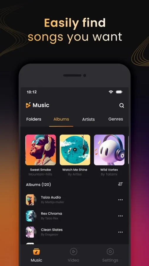 • Browse and play your music by albums, artists, genres, songs, playlists, folders, and album artists.