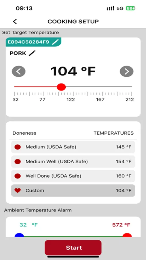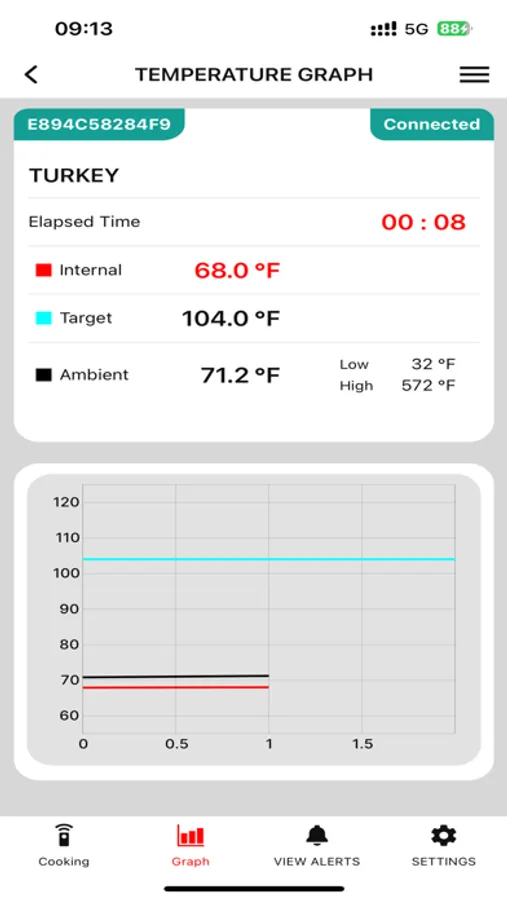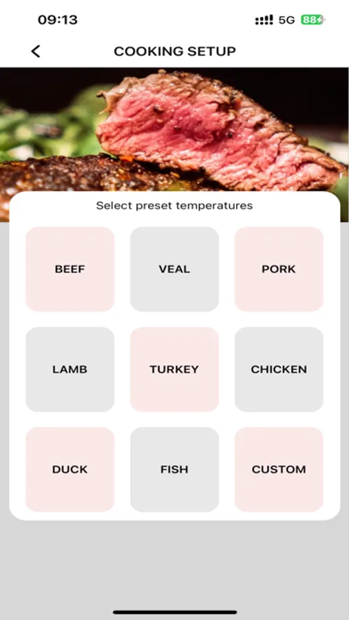 The Smart Probe™ Thermometer App is connected to the thermometer to show temperature readings and used to set desired cooking temperatures.