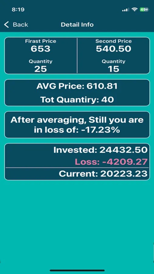 Detail Information Screen: Monitor to see after averaging how much the user has invested, loss(In value and percentage), and current value.