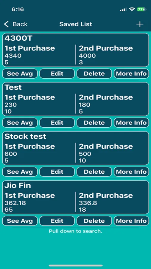 List Screen: Save the stock averages and search the stock averages by pulling down the list. Not only that users can view, edit, delete and see detailed info about the the stock averages from the list
