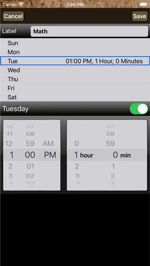 • Alarm options include silence