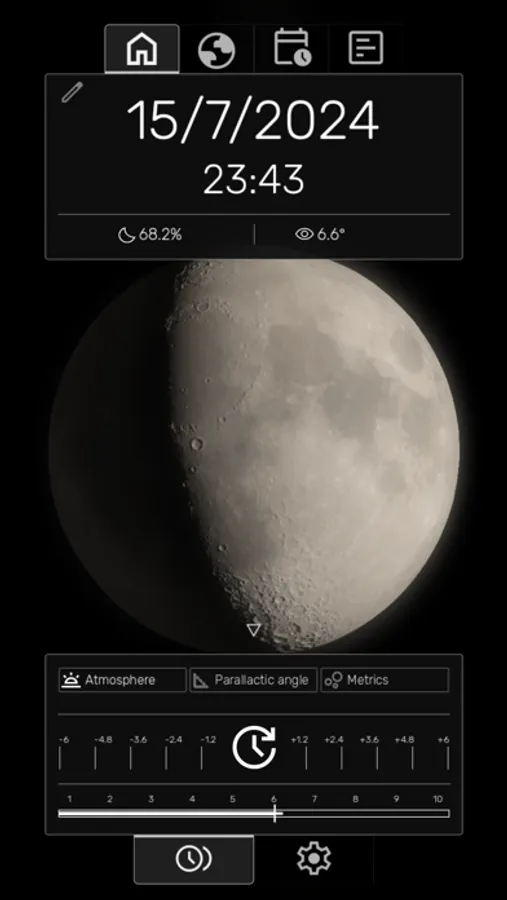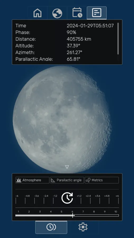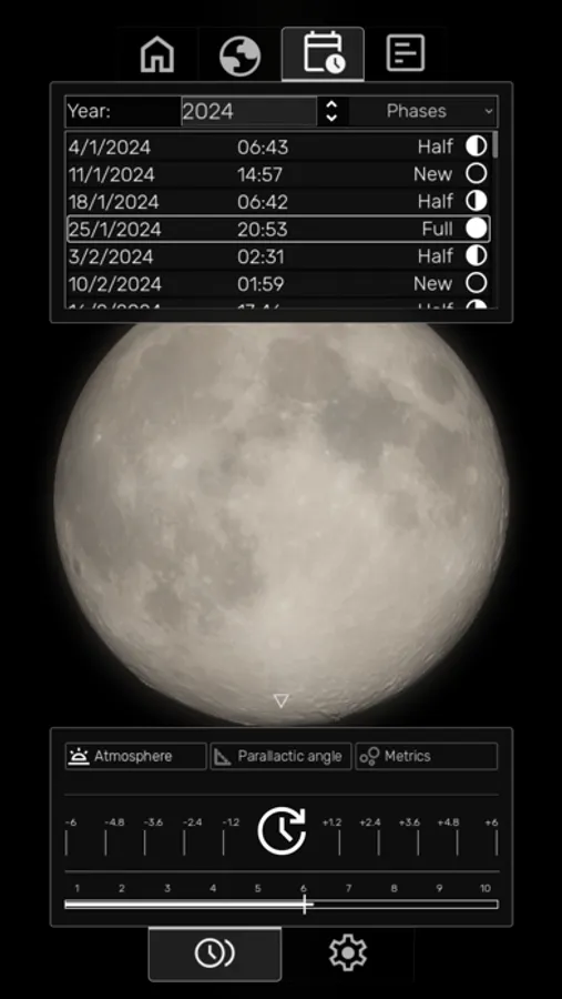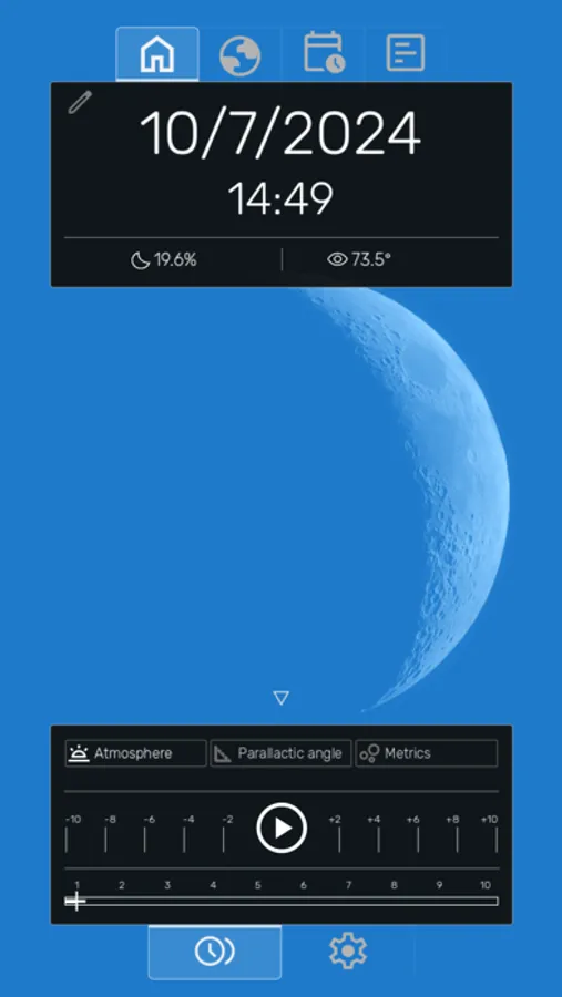 - Real-Time Moon Rendering: Witness the moon's phases, liberations, and apogee/perigee with astonishing realism and accuracy. Use the intuitive time controller to seamlessly move forwards or backwards, witnessing the Moon's phases unfold continuously. Or, simply pick a specific date and time to jump to using the time picker.
