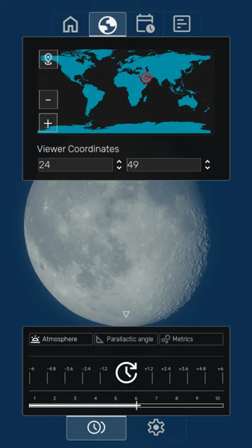 - Earth Map with Moon Position: View the moon's current overhead position on the map. You can also select your location to see the parallactic angle of the moon phase, offering a unique perspective based on your geographic location.