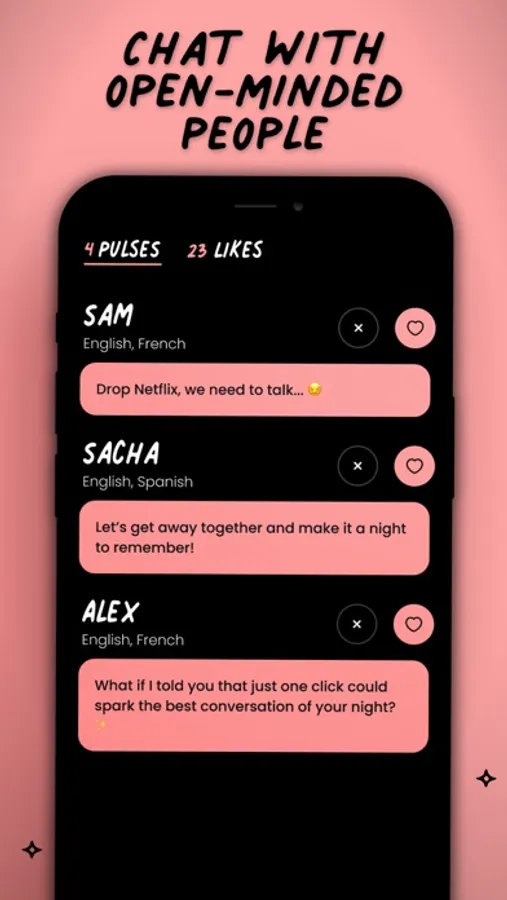 Hush is for everyone: curious minds, adventurous couples, the shy, the bold, the asexual, the straight, the queer. We welcome all walks of life and every way of connecting. Whether you're exploring new conversations, discovering new communities, or just chatting anonymously, this is your space.