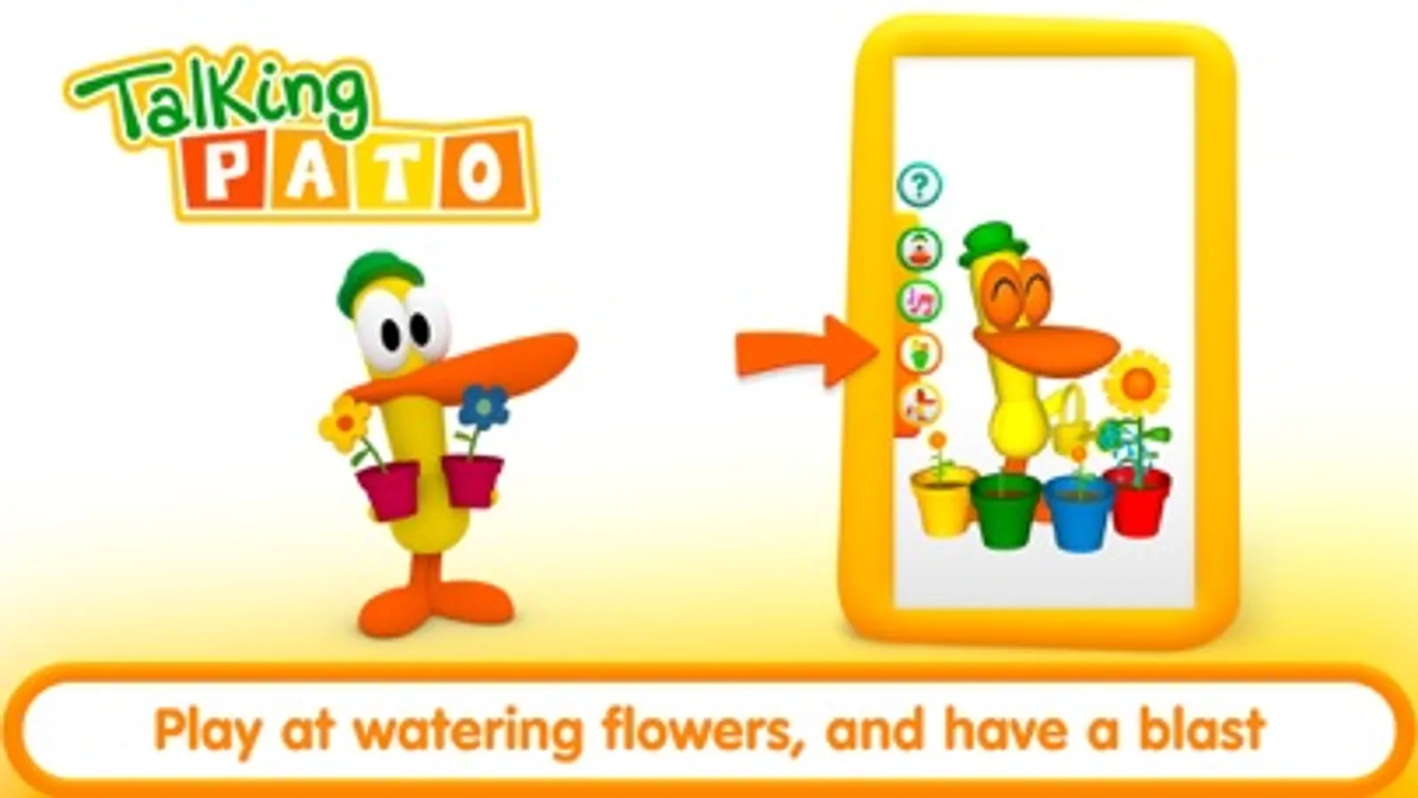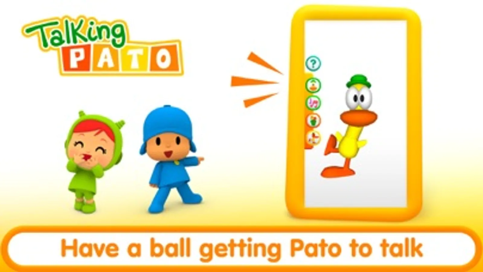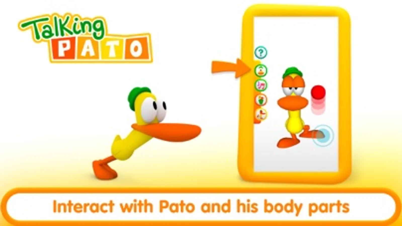 - Interact with Pato: Pato is waiting attentively for you to talk to him and repeat whatever you say in a funny way, just like Pocoyó in Talking Pocoyó. And, if you touch different parts of his body, you'll discover the funny stuff he does: gargling, doing like he's kicking a ball, and throwing his hat in the air are some. What are you waiting for to discover it all?