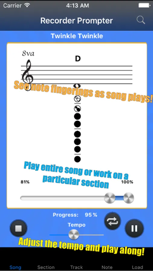 Recorder Prompter can automatically loop either a whole song or a section of a song, so you can highlight a passage you want to focus on and play it along with Recorder Prompter—over and over until you learn it perfectly!