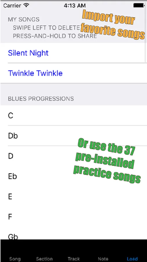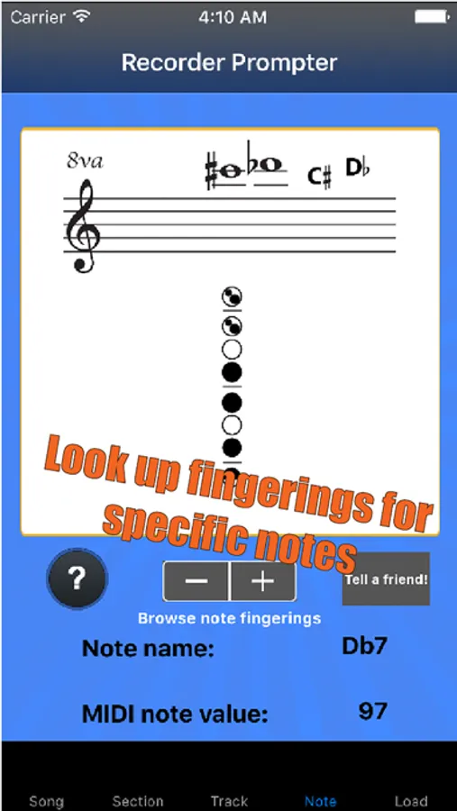 Recorder Prompter is a great tool for people trying to learn to play on their own, or with a private teacher, or in a school environment. Instructors can prepare weekly lessons as MIDI files and e-mail them to students so students can practice the RIGHT music, in the most productive way possible! Delete an imported song by swiping a finger across the title in the song list. Or share an imported song via e-mail, by pressing-and-holding on the song title in the song list.