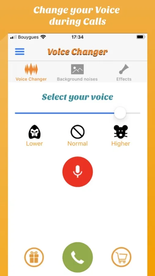 Tired of those voice changer that give you random exemples of voice changing and don't show how YOUR voice will sound before calling ? With Voice Changer Allogag precisely and manually adjust voice changing effects and preview the result on YOUR voice. Imitate a lot of different voices thanks to our manual voice changing system. Because we think YOU should choose the perfect voice, we don't offer pre-selected voices.