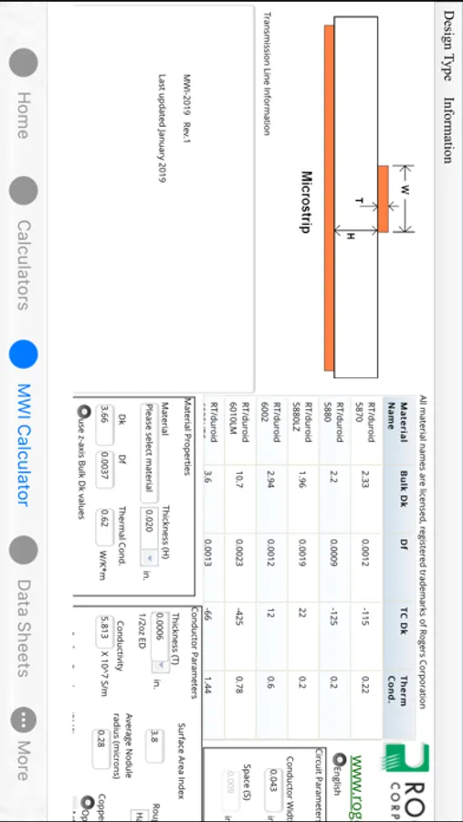 This software is intended to assist with microwave circuit design in predicting the impedance of a circuit made with Rogers High Frequency circuit materials. Additionally, the software also provides some capabilities for predicting transmission line losses.